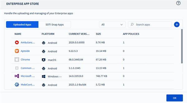 The Enterprise App Store provides a hub to manage Enterprise and SOTI Snap applications for deployment through app policies. Enterprise applications can be uploaded directly to SOTI MobiControl for use on Android, Apple (iOS, MacOS and tvOS) and Windows Modern devices. SOTI Snap applications for Android devices can also be managed after deployment through an app policy.