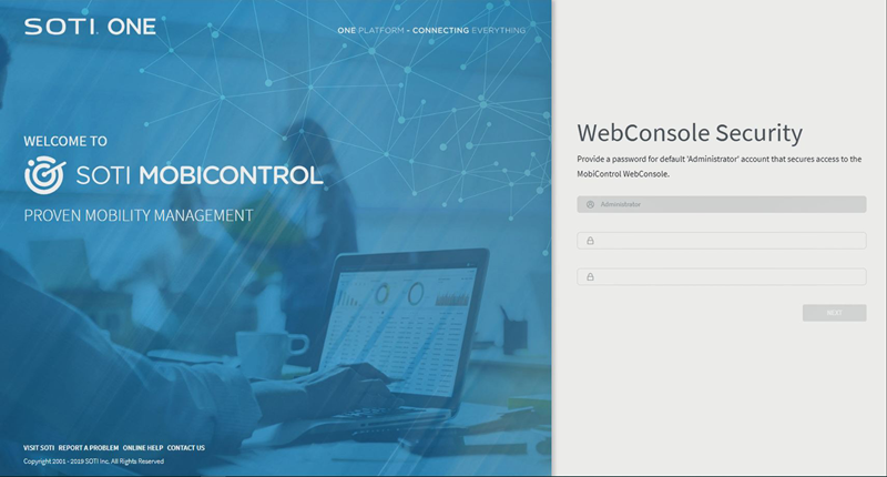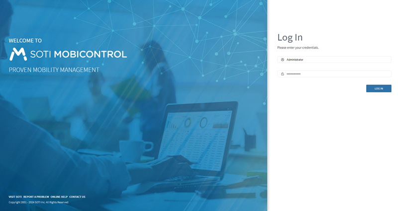 - Launch the SOTI MobiControl console: In a web browser, go to the System Root URL or managementServiceAddress/MobiControl.