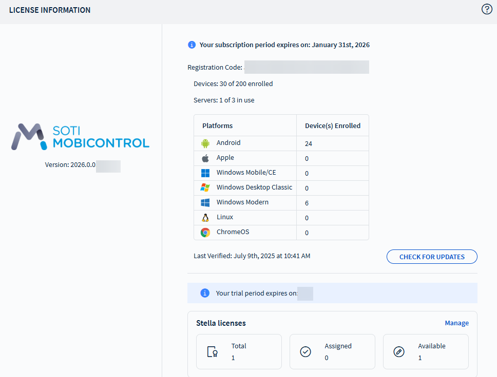 Stella licenses enable users to query and chat with Stella, SOTI MobiControl's integrated AI chatbot. Stella uses natural language prompts to perform tasks in SOTI MobiControl's web console and query device information. See Using Stella for more information on installing and managing Stella.
