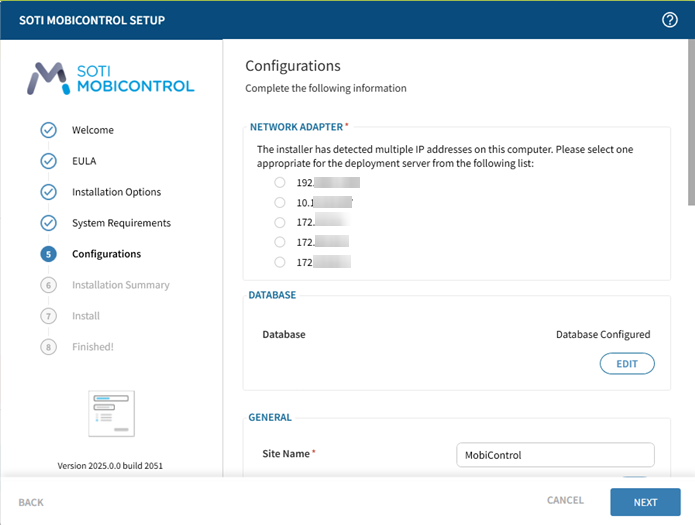 - Skip: Skip SSL certificate installation and configure it later with SOTI MobiControl Administration Utility.