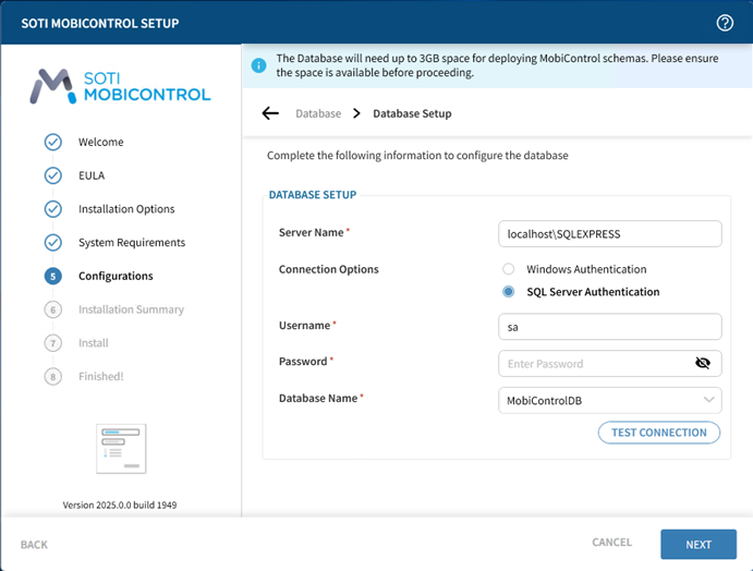 Note: This panel appears only if you opted not to download and install Microsoft SQL Server 2022 Express. See Database Requirements for more information.