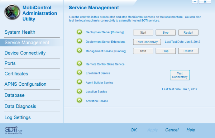 as well as test their connection. From this window the MobiControl Administrator can also perform Stop / Start and Restart