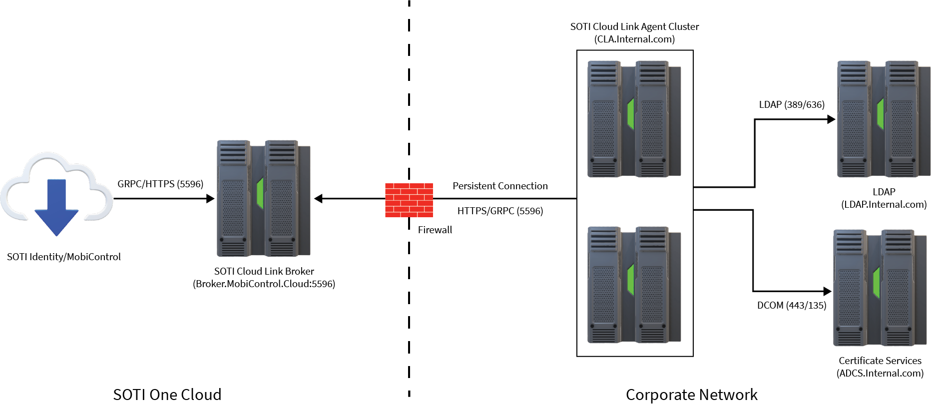 To improve high availability or scalability, you can load balance SOTI Cloud Link Agent communication using a high-availability SOTI Cloud Link Agent cluster configuration. With SOTI Cloud Link Agent version 4.0, the high-availability deployment implementation does not require a physical load balancer, instead SOTI Cloud Link Agents are used in high-availability active-active cluster configuration to achieve load balancing and redundancy. In this topology, the SOTI ONE application and the SOTI Cloud Link Agent cluster communicate with the same SOTI Cloud Link Broker installed on the SOTI instance.
