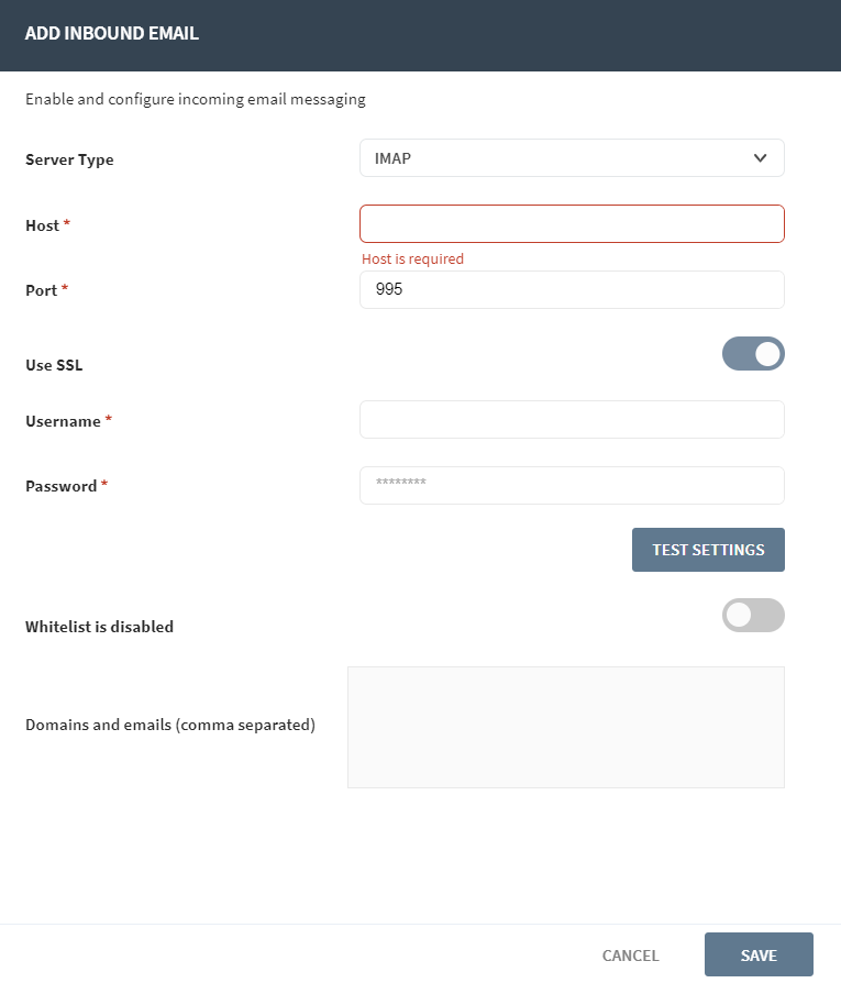 Note: Use the following table to configure the inbound email settings.Server Type Select the inbound email server type from the drop-down list: "POP3," "IMAP," or "Office 365." Most fields in this section change depending on the server type you have selected. Host Appears for "POP3" and "IMAP." Enter the hostname of the inbound email server that receives emails. Port Appears for "POP3" and "IMAP." Enter the port used by the inbound email server to receive emails. Use SSL Appears for "POP3" and "IMAP." Enable if the inbound email server used to receive emails uses secure communication. Username Appears for "POP3" and "IMAP." Enter the username to authenticate on the inbound email server. Password Appears for "POP3" and "IMAP." Enter the password to authenticate on the inbound email server. Email Appears for "Office 365." Enter the email address for receiving incoming emails (for example, mobilesupport@<yourcompanyname>.com). Client ID Appears for "Office 365." Enter the Client ID value you have obtained when registering with Microsoft. Tenant ID Appears for "Office 365." Enter your Microsoft Tenant ID. Client Secret String Appears for "Office 365." Paste the Client Secret value you obtained when registering with Microsoft. Polling Frequency Appears for "Office 365." The default email polling period is 2 minutes. Optionally, change the frequency by entering a different number of minutes. Test Settings After saving changes, select this button to test receipt of an inbound email using the current configuration. Errors (if any) display on the screen. Whitelist is Enabled/Disabled Toggle on to enable whitelisting of specific domains and/or email addresses. Domains and Emails (Comma Separated) If you have enabled whitelisting, enter a comma-separated list of email addresses and domains from which to accept inbound emails. Important: Leaving this field empty blocks all inbound emails. - Select Test Settings to test receipt of an inbound email using the current configuration. Any errors display on screen.