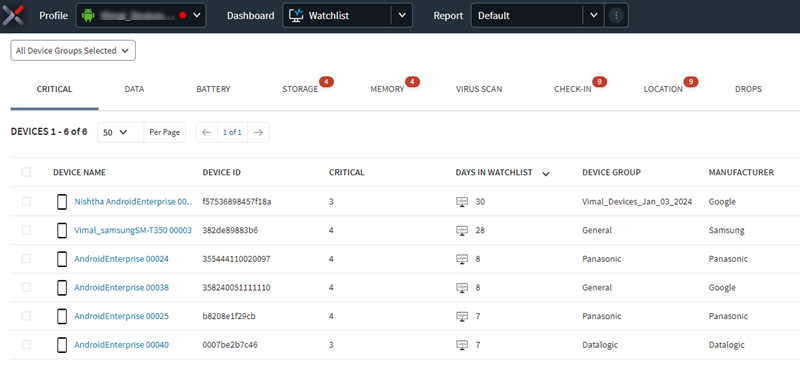 The Watchlist Dashboard provides a view of all devices in violation of specific criteria defined in the Analysis Profile. The number of devices in violation displays beside each criteria tab.