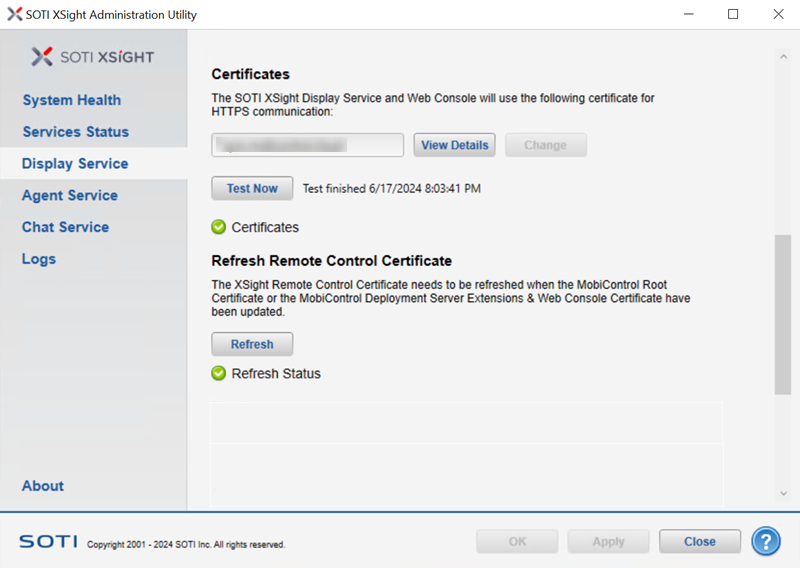 | Refresh | Refresh the SOTI XSight Remote Control certificate. |