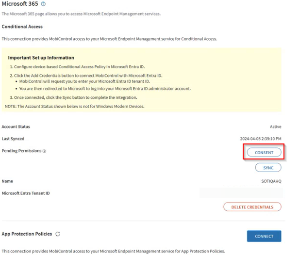 - Retry/ try SOTI MobiControl integration with Microsoft 365 Conditional Access using Method One: Automatic Microsoft and SOTI MobiControl Setup (Microsoft 365 Conditional Access Integration)