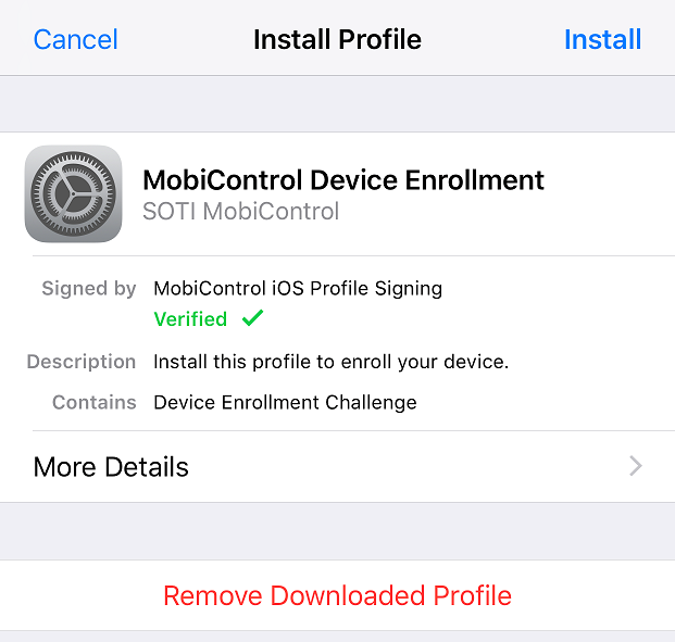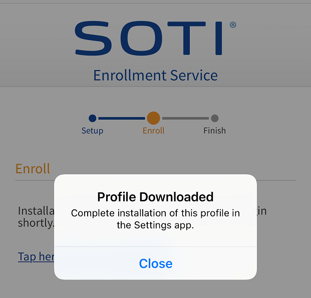 On devices running iOS 12.2 or later, when downloading either the Trust or Enrollment (MDM) Profile during the iOS device enrollment process, the user is presented with a prompt saying “Complete Installation of this profile in the Settings app.”: